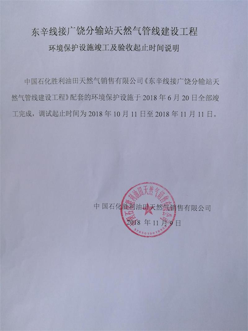 東辛線接廣饒分輸站天然氣管線建設(shè)工程環(huán)境保護(hù)設(shè)施竣工及驗(yàn)收起止時(shí)間說(shuō)明