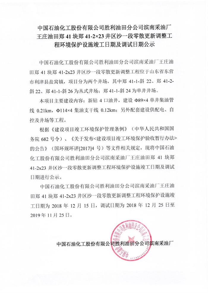 中國(guó)石油化工股份有限公司勝利油田分公司濱南采油廠王莊油田鄭41塊41-2×23井區(qū)沙一段零散更新調(diào)整工程環(huán)境保護(hù)設(shè)施竣工日期及調(diào)試日期公示