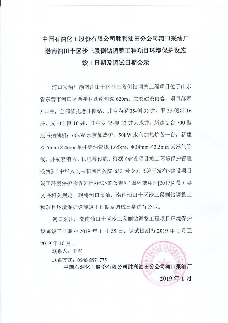 中國石油化工股份有限公司勝利油田分公司河口采油廠渤南油田十區沙三段側鉆調整工程項目環境保護設施竣工日期及調試日期公示